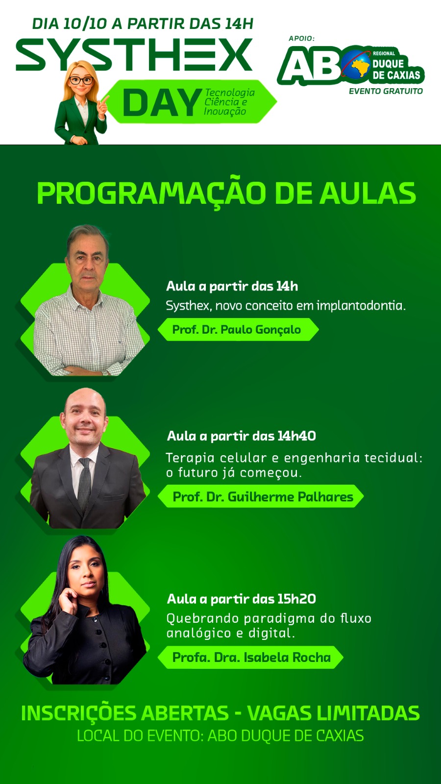 O Systhex Day é um evento de um dia que trará os conceitos odontológicos nas áreas de Implantodontia aos profissionais que utilizam ou tem o desejo de conhecer as soluções. As aulas terão apresentações dos Preletores (Speakers) que trarão os conceitos e os casos aplicados.